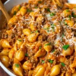 The rich aroma of simmering garlic and onion wafts through the kitchen, mingling tantalizingly with the hearty scent of sizzling ground beef. A bubbling skillet beckons, filled with tender shell pasta enveloped in a creamy, vibrant tomato sauce, a dish painted in warm hues that invites both family and friends to gather around the table. Each spoonful promises a satisfying experience, a glorious dance of flavors that celebrates comfort in its purest form. As the cheese melts, it stretches and glistens, coaxing you closer, while the colorful flecks of fresh herbs add a touch of brightness to this luscious delight.