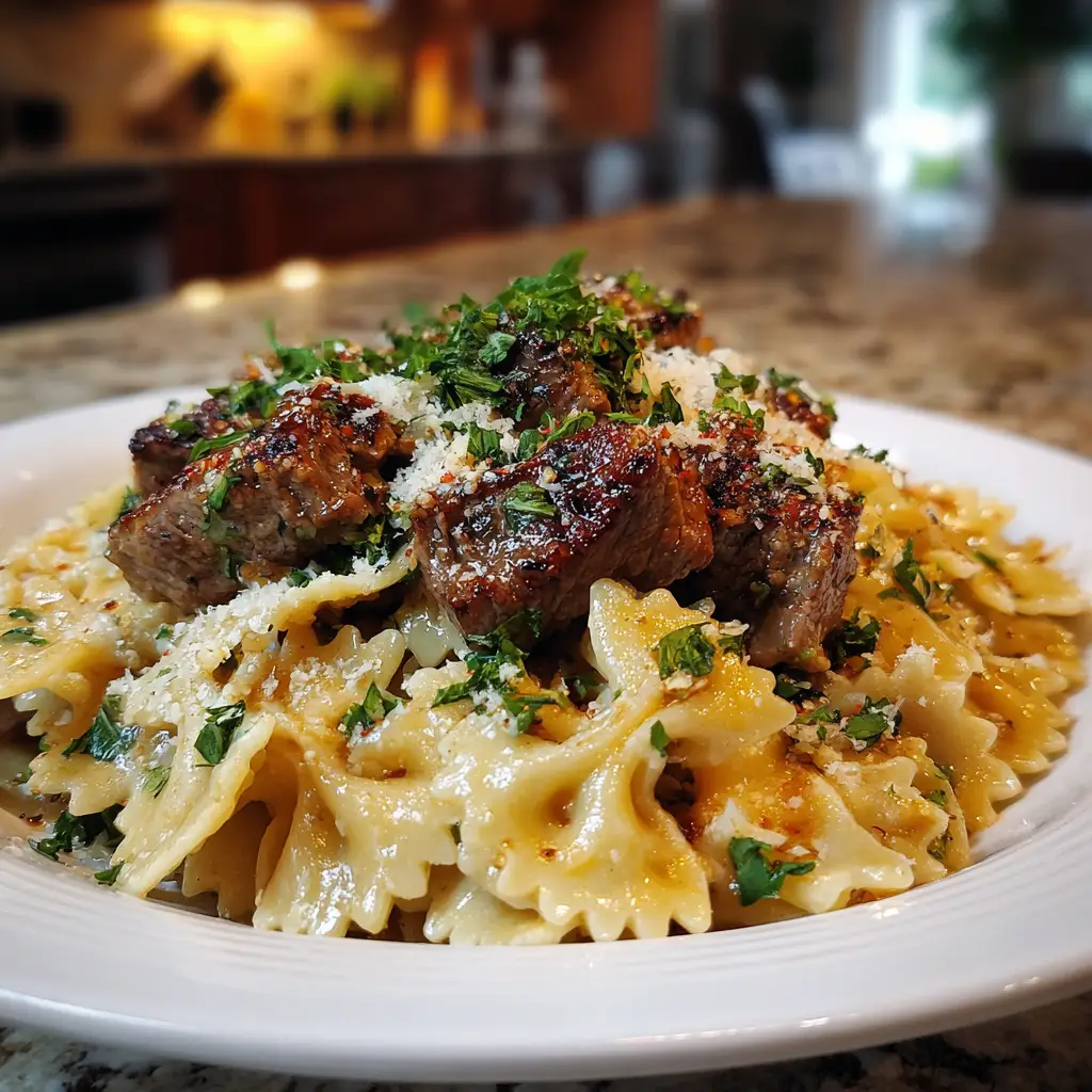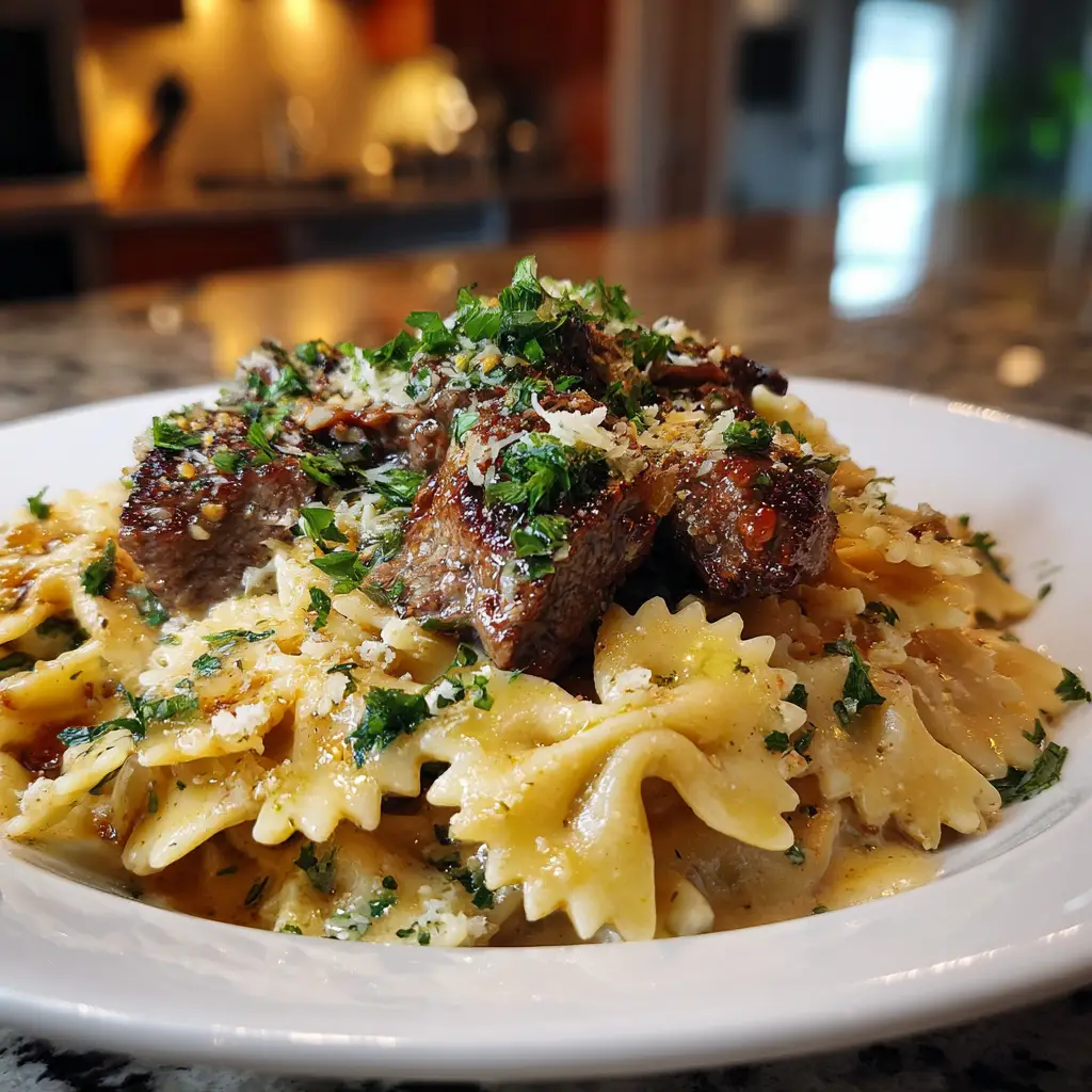 Indulge in this creamy parmesan garlic beef bowtie pasta! A rich, satisfying meal with tender beef and farfalle, ready in just 30 minutes.