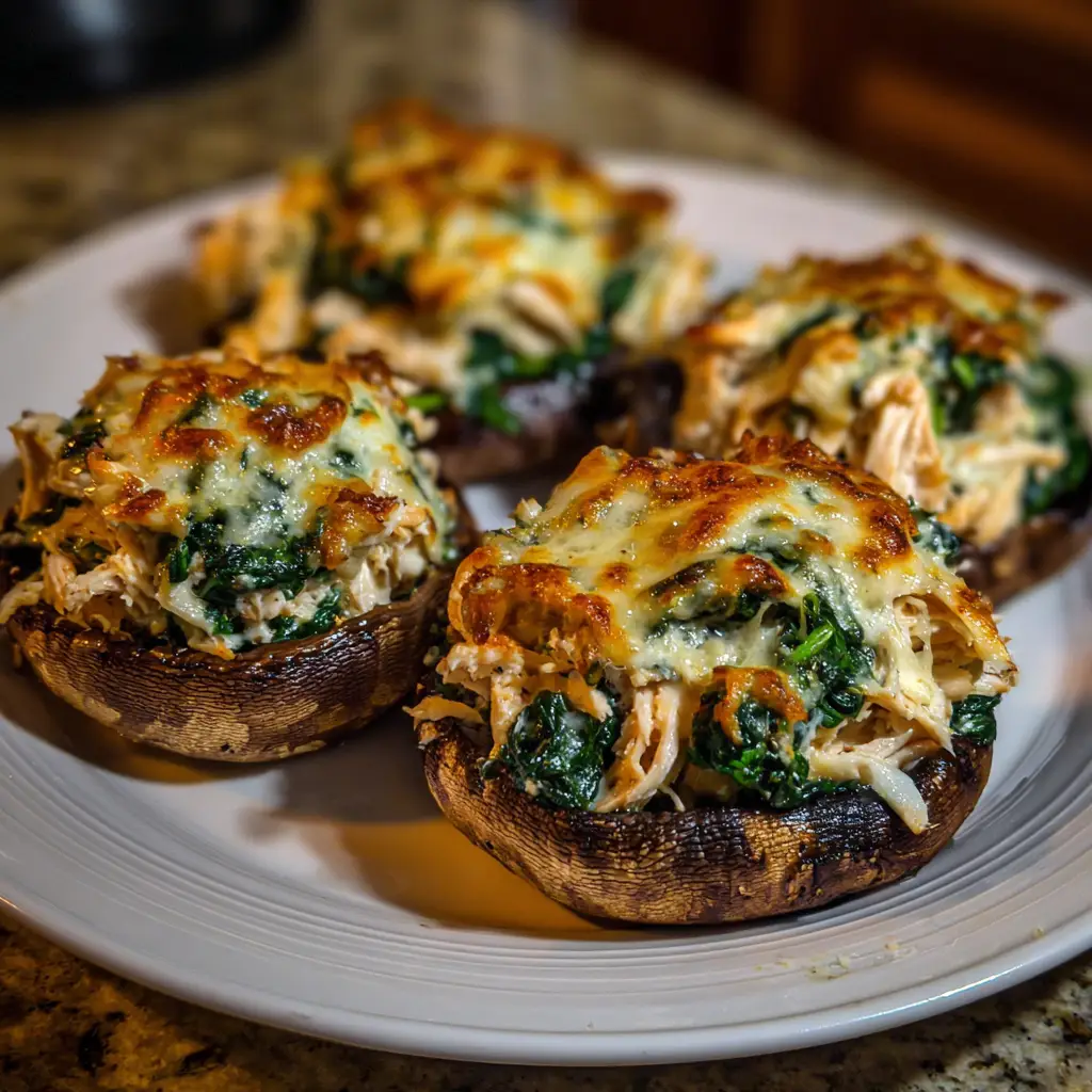 You will love the textural symphony in every bite: the tender, meaty, and slightly juicy flesh of the roasted portobello cap giving way to the creamy, savory, and well-seasoned chicken and spinach filling, all topped with the delightful stretch and slight crunch of melted, bubbly cheese. You will love the deep, harmonious flavor—the earthy, umami base of the mushroom, the savory depth of the chicken and garlic, the fresh, slightly bitter note of the spinach, the rich creaminess of the cheese, and the bright, herbal finish from thyme or parsley.