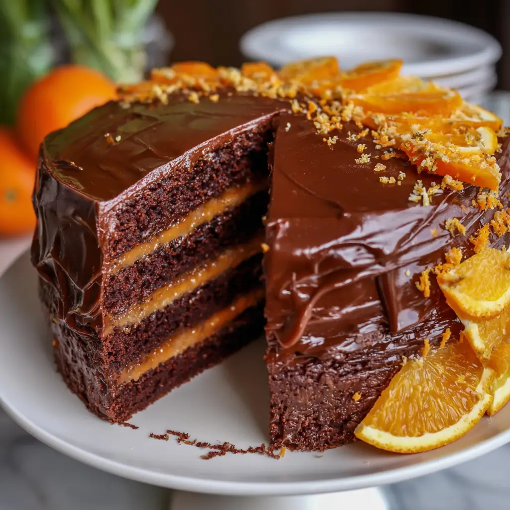 Layers of moist chocolate cake brushed with orange syrup, filled with silky orange cream, and covered in rich chocolate ganache.