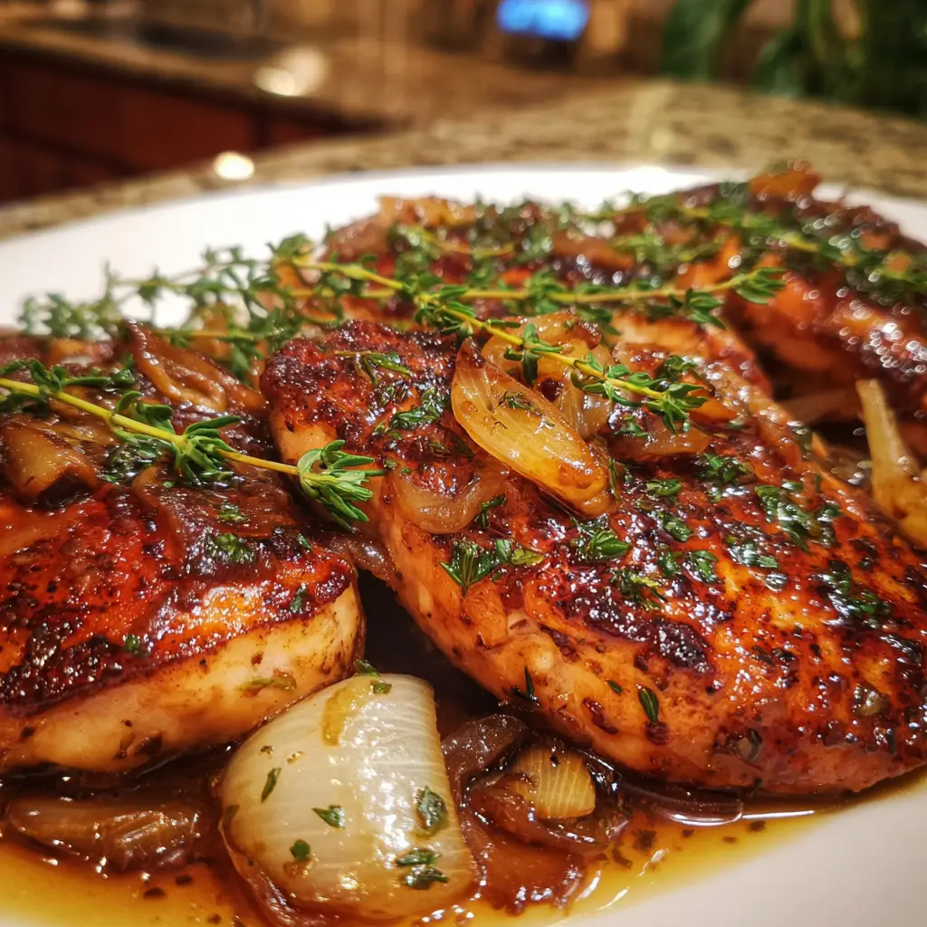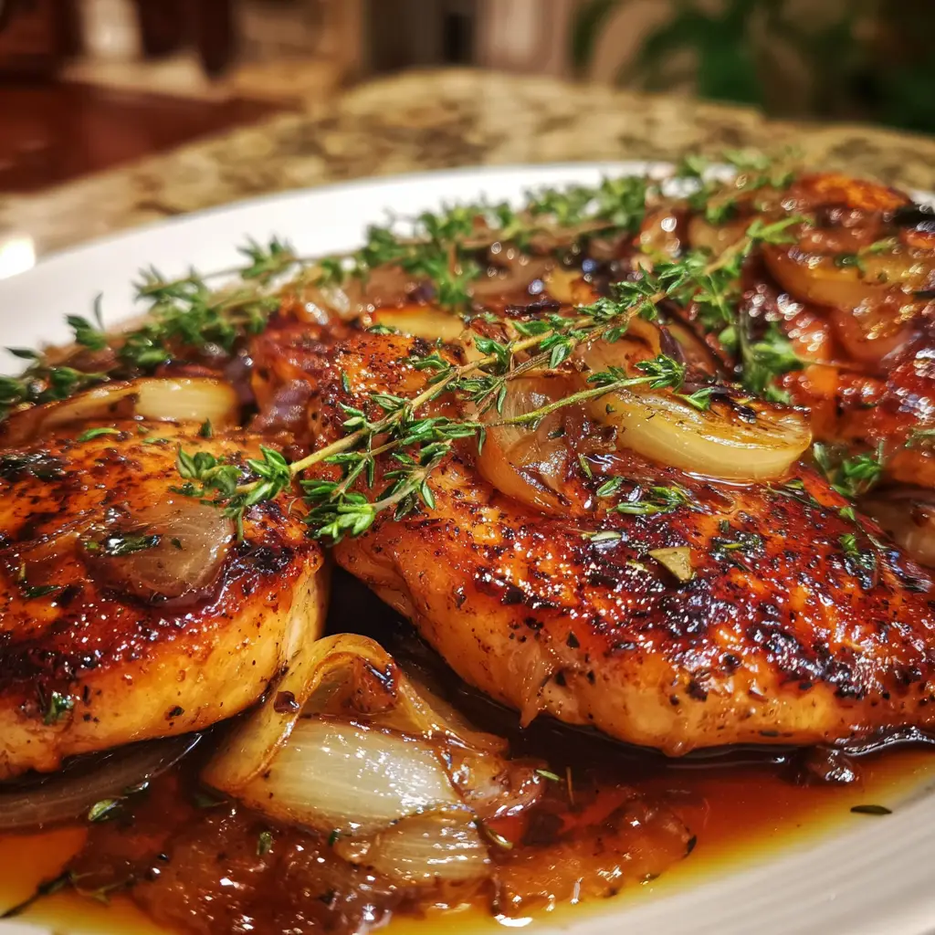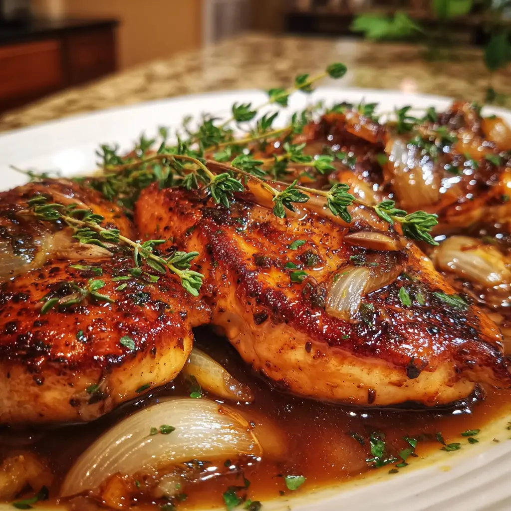 Carefully remove the skillet from the oven (remember the handle is hot!). Transfer the chicken, apples, and onions to a serving platter. Place the skillet back on the stovetop over medium heat. Bring the sauce to a simmer and let it reduce for 3-5 minutes, until it thickens slightly and becomes syrupy. Remove from heat and swirl in the cold butter, one piece at a time, until the sauce is glossy and rich. Taste and adjust seasoning with salt and pepper. Pour the magnificent sauce over the chicken on the platter. Garnish with fresh thyme.