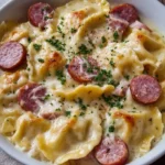 A comforting casserole combining rich, creamy pierogi with savory kielbasa and caramelized onions, cooked slowly for a delightful flavor.