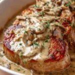 A comforting dish featuring juicy pork chops bathed in a creamy mushroom sauce, perfect for family gatherings or weeknight dinners.