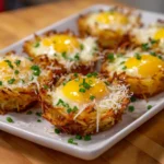 A delicious breakfast dish featuring eggs baked in crispy hash brown baskets, perfect for a hearty morning meal.