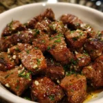 Imagine capturing the most decadent, luxurious essence of a high-end steakhouse experience, the sizzle of a perfectly seared steak, the intoxicating aroma of garlic and herbs browning in butter, the deep, savory flavor of a rich pan sauce, and transforming it into a stunning, shareable, and utterly irresistible appetizer. Welcome to Garlic Butter Steakhouse Bites. This dish is not merely cubed steak; it is a culinary event in miniature. Tender, juicy pieces of premium filet mignon or sirloin are seared to a perfect medium-rare crust in a blazing hot skillet, then instantly bathed in a bubbling, golden bath of melted butter infused with fresh garlic, fragrant rosemary, and a splash of wine. The result is a plate of bite-sized morsels that are astonishingly tender on the inside, gloriously caramelized on the outside, and utterly saturated with a sauce so good you’ll want to drink it with a spoon.