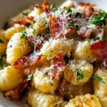 A comforting dish of gnocchi tossed in a creamy carbonara sauce with crispy bacon, Parmesan cheese, and garlic.