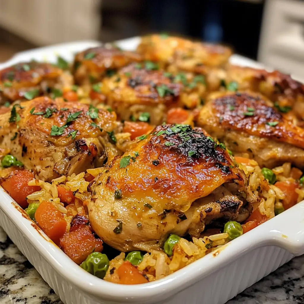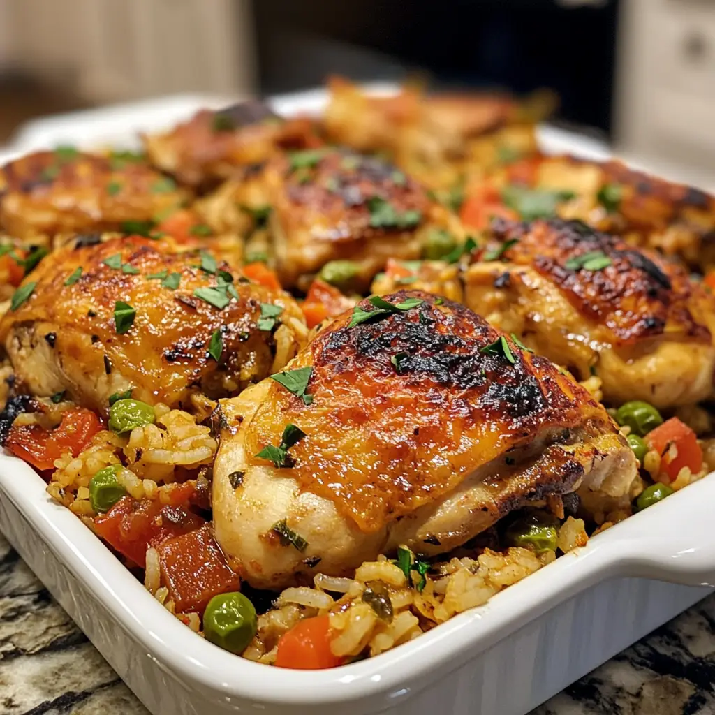 Take the marinated chicken pieces and arrange them in a single layer on top of the rice and vegetable mixture. Pour any remaining marinade from the bowl over the chicken. This will seep down and flavor the entire casserole as it bakes.