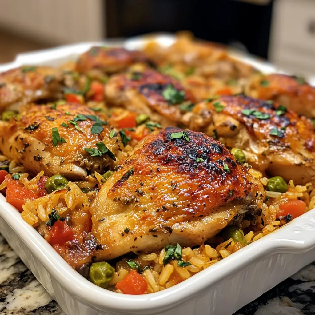 Take the marinated chicken pieces and arrange them in a single layer on top of the rice and vegetable mixture. Pour any remaining marinade from the bowl over the chicken. This will seep down and flavor the entire casserole as it bakes.