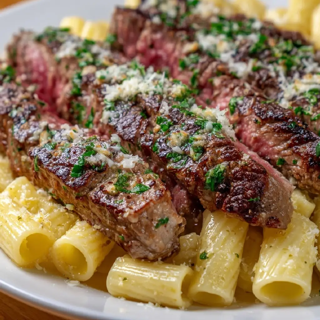 Keywords: Garlic Butter Steak, Cheesy Rigatoni, Steak Recipe, Pasta Recipe