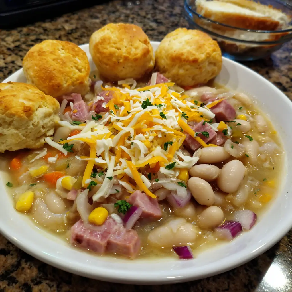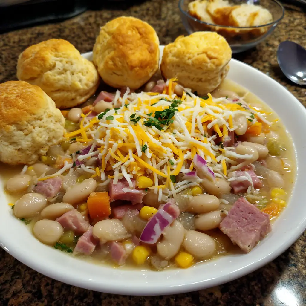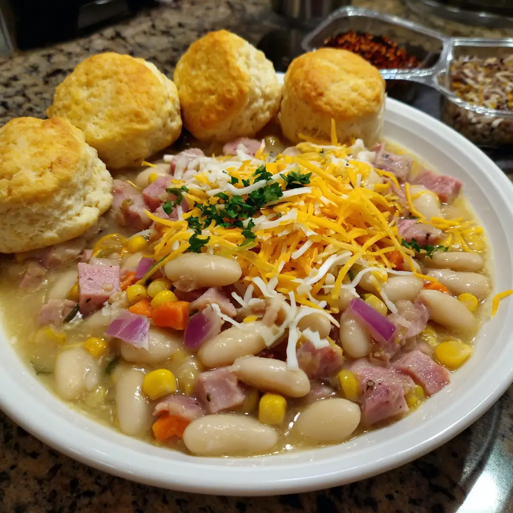 Slow Cooker White Chili with Ham & Cheese Biscuits