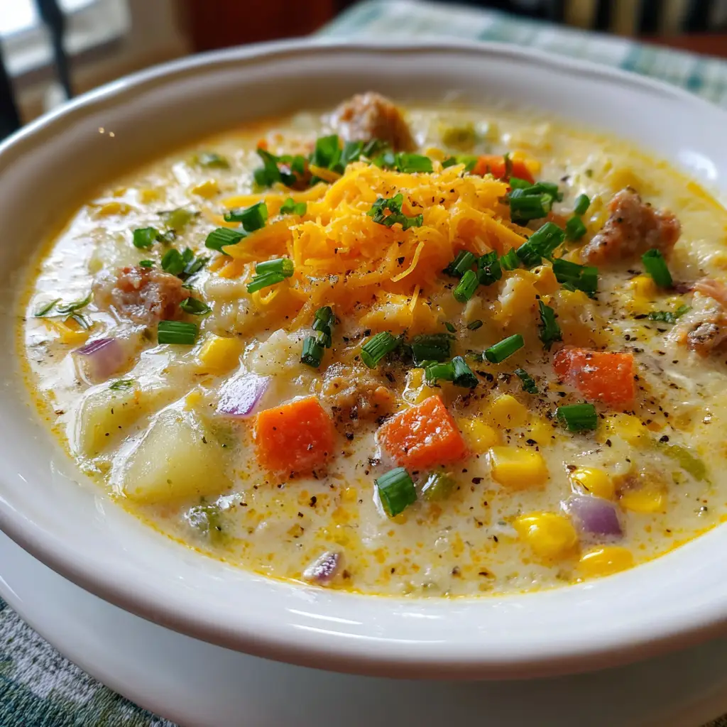 • Smoky Bacon & Corn Chowder: Begin by cooking 6 slices of diced thick-cut bacon until crispy. Remove the bacon and use the rendered fat to sauté the vegetables. Use the bacon as a garnish.