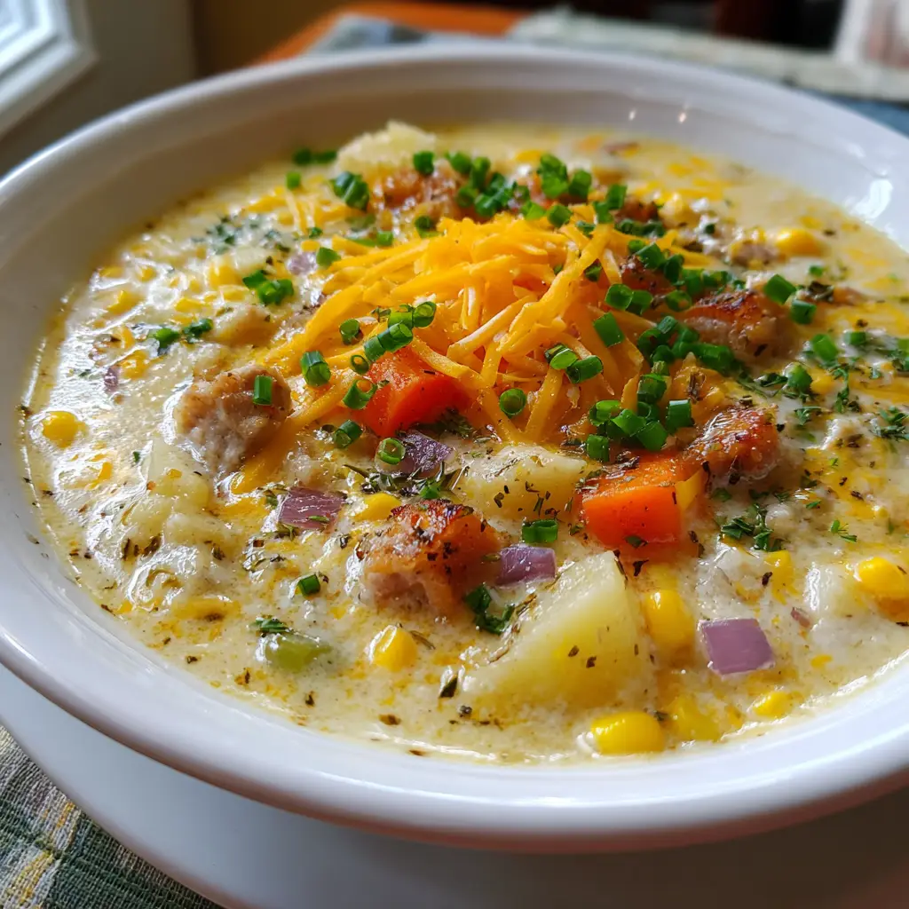 • Smoky Bacon & Corn Chowder: Begin by cooking 6 slices of diced thick-cut bacon until crispy. Remove the bacon and use the rendered fat to sauté the vegetables. Use the bacon as a garnish.